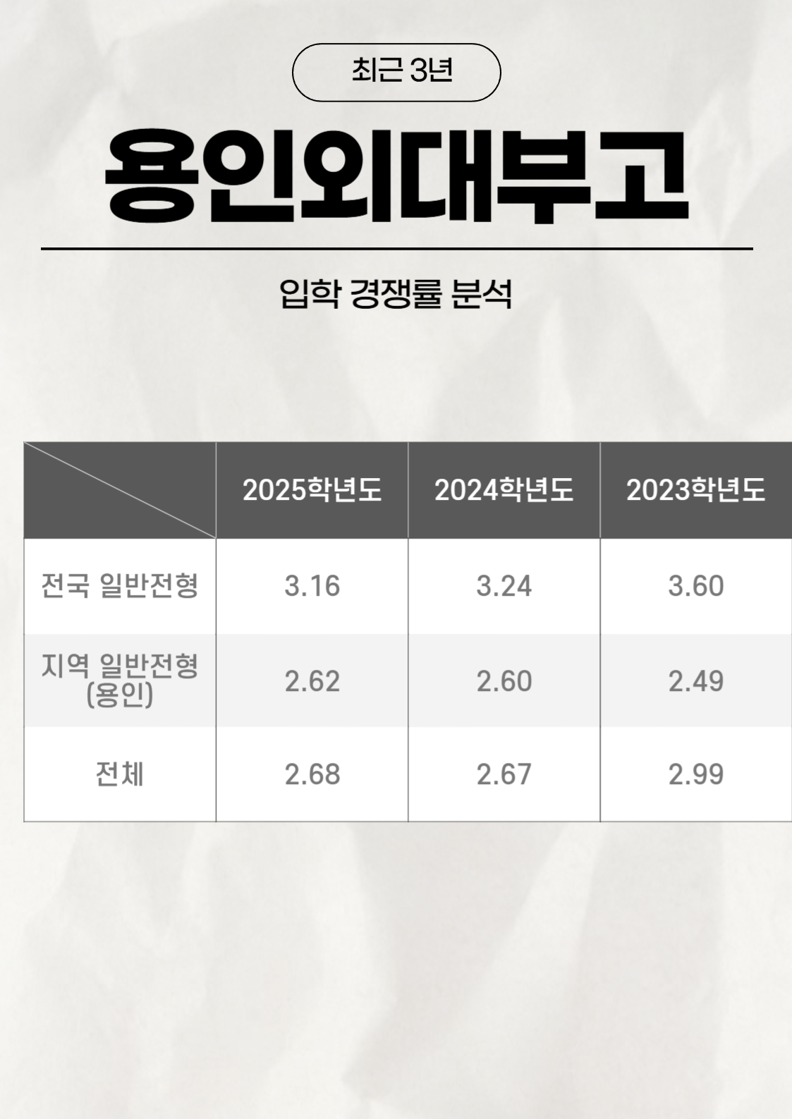 용인외대부고는 2025학년도에 정원 내 기준 350명을 모집합니다. 이는 지난해와 동일한 규모인데요. 2024년 12월 11일 원서접수를 마감한 결과, 총 939명이 지원하여 경쟁률은 2.68대 1로 마감하였습니다. 전국 모집 규모는 245명으로 전체의 70%를 차지하며, 용인 지역 우수자 선발은 105명으로 30%를 차지합니다. 전국 일반전형은 196명을 모집하는데 960명이 지원하여 가장 높은 경쟁률인 3.16대 1을 기록하였습니다. 이는 작년 3.24대 1에서 소폭 하락한 수치입니다. 지역 우수자 선발 일반전형에서는 84명 모집에 220명이 지원하며 2.62대 1의 경쟁률을 보여, 작년 2.6대 1에 비해 소폭 상승했습니다.