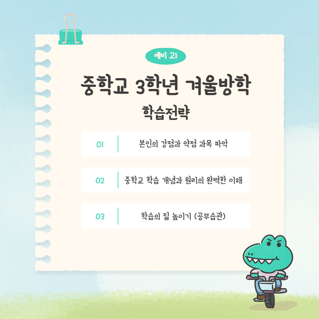 내년이면 고등학교 1학년이 되는 현 중학교 3학년 학생들에게, 이번 겨울방학은 고등학교 입학을 준비하는 중요한 시기입니다. 이번 글에서는 중3 학생들이 겨울방학 동안 활용할 수 있는 효율적인 공부 플랜과 고입 대비 전략, 성적 상승을 위한 실질적인 방법을 소개합니다.