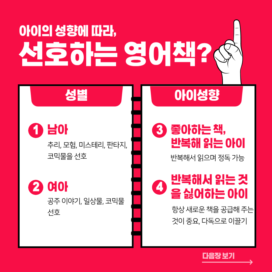 또 아이의 성별과 성향에 따라 좋아하는 책이 많이 다릅니다. 이는 비단 영어책 뿐만 아니라, 한글책에서도 이러한 성향이 반영되더라구요. 그러니 자녀가 선호하는 책 유형은 어떤지, 부모가 아는 것이 가장 중요하겠죠?
