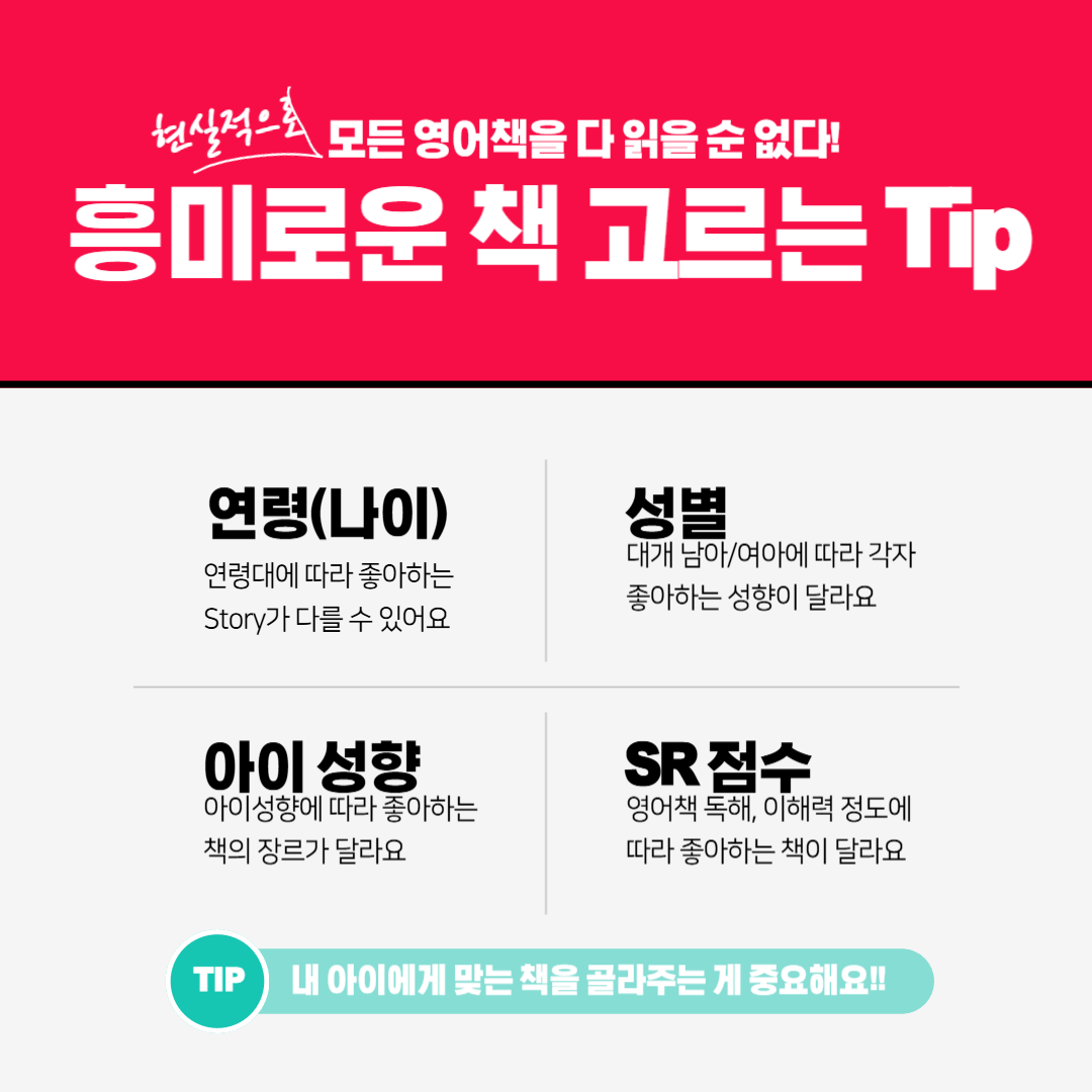 가장 고려할 점은 자녀에게 어떤 영어책을 읽도록 할 것인가입니다. 전문가는 아니지만, 저는 아래 4가지 기준이 중요하다고 생각합니다. 바로 연령과 성별, 아이성향, 그리고 SR점수인데요. 그중에서도 중요한 건 SR점수입니다. 아이가 읽을 수 있는 수준을 파악해야 하거든요.