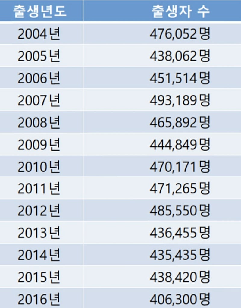 위 표는 출생년도별 출생자수를 나타내는데요. 현 중3인 2009년생 학생 수(444,849명)가 전년도 중3인 2008년생 학생 수(465,892명)보다 4% 감소한 것을 고려하면, 실질적으로는 경쟁률은 소폭 상승한 것으로 재해석될 수 있습니다. 전국 일반전형의 경우, 모집인원 감소로 인해 경쟁률이 2.36에서 2.56으로 상승했으며, 사회통합전형과 지역인재전형 등 기타 전형의 경쟁률은 하락했습니다. 이러한 결과는 대입 제도 변화에 대한 불확실성과 학령인구 감소 등 여러 요인이 복합적으로 작용한 것으로 분석됩니다.